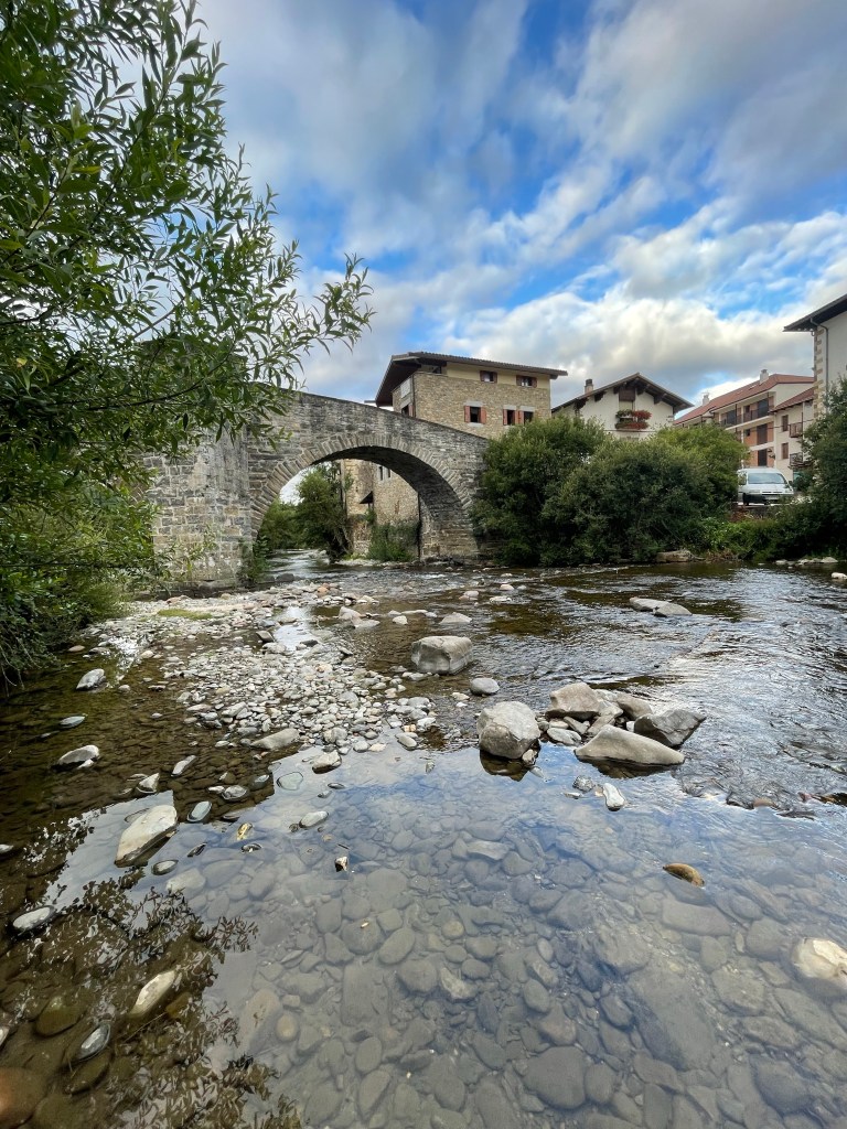 La segunda sensación del día es el Arga. Más que una sensación, un cúmulo de ellas, todas agradables. Se muestra como torrente, se crece en algunos puntos formando cascadas poco estrepitosas y dóciles que casi arrullan al peregrino como una presencia benévola. A veces lo pierdes de vista, pero sabes que sigue estando cerca: si no lo ves, lo oyes, lo intuyes, lo recuerdas, te reencuentras con él vestido de otra guisa o adornado con puentes nuevos como si solo quisiera sorprenderte.
