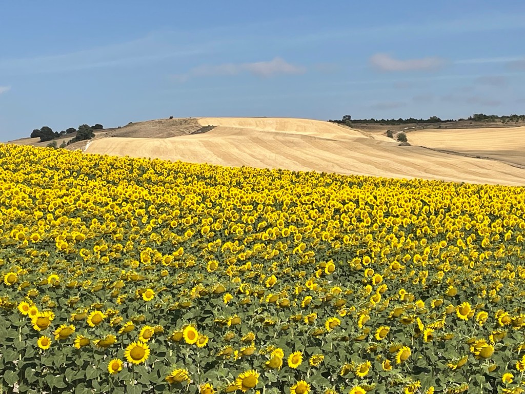 Andiamo avanti per un bel po’ e, quasi quando stiamo per attraversare di nuovo l’Arlanzón, troviamo il locale di un panettiere aperto, che emana un profumo irresistibile di dolci appena sfornati. Lì si sono indirizzati vari altri pellegrini che sembrano essere usciti dal nulla, e quel piccolo negozio si riempie in un attimo di camminatori affamati di carboidrati. Compriamo un paio di napolitanas e le mangiamo appena usciti per ingannare lo stomaco, che ha bisogno di qualcosa di caldo per sentirsi a posto, anche se oggi ci metterà un po’ nel riuscirci. Continuiamo a camminare, attraversiamo una zona moderna della città, il campus universitario, che ha sicuramente qualche somiglianza con i campus moderni dell’Europa. Complessi residenziali privati attorno. «Buon posto per viverci», ho pensato. Sembra che la città non finisca mai, ma quando arriviamo ai vivai Los Guindales, dice la nostra guida che raggiungiamo ufficialmente l’ultima frontiera. Pian piano salutiamo il marciapiede. C’è un vento freddo che ci rammenta l’autentico freddo burgalese. Il sole sta sorgendo. Girasoli, campi di cereali. Abbiamo la sensazione di aver iniziato ufficialmente la giornata.