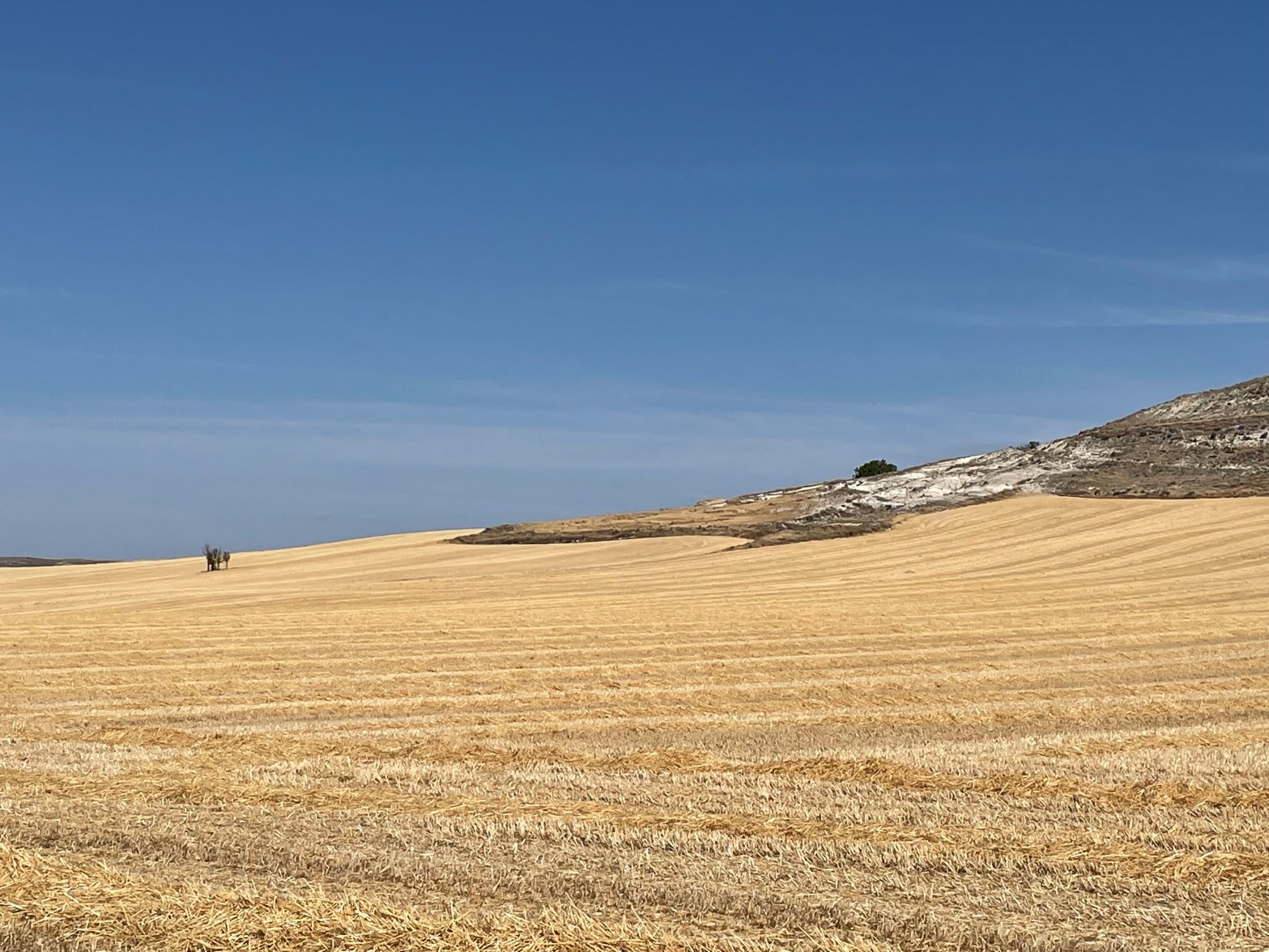 Con lo stomaco soddisfatto e le gambe più riposate, andiamo avanti. Passiamo alcuni paesi: Rabé de las Calzadas, Hornillos del Camino… Il paesaggio lo formano fondamentalmente le grandi estensioni della meseta, con nuovi campi di cereale, colli semiaridi che spesso rompono la riga dell’orizzonte, impianti eolici moderni che ci fanno segni movendo le braccia, come se non riuscissimo a vederli. Secondo la nostra guida, Hontanas è a 31,1 km da Burgos, a cui bisogna aggiungere tutto quello che abbiamo camminato prima di lasciare la città, ma c’è anche da sottrarre il fatto che non arriviamo alla fine (e meno male, perché come al solito gli ultimi metri sono i più difficili). Questa volta abbiamo prenotato nell’ostello Fuente Sidres, più o meno a un chilometro e mezzo prima di arrivare in paese.