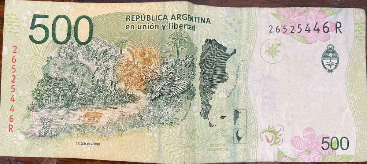 Le banconote che vedete qui (niente monete metalliche, il valore non lo giustifica) sono solo un assaggio di quelle che ci sono passate tra le mani. Le trovo splendide: in linea di massima, i tagli più alti celebrano eroi nazionali, quelli più bassi sfoggiano animali simbolo del Paese, di cui gli argentini vanno fieri: lo yaguareté, la balena e l’hornero.