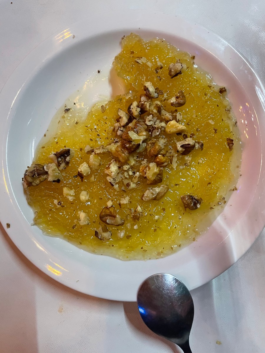 In un’altra occasione ho assaggiato il dulce de cayote con le noci. Il cameriere mi ha spiegato che il cayote è una varietà di zucca di cui si ricava la polpa per zuccherarla, profumarla e trasformarla in un dessert al cucchiaio. Mi ha ricordato molto il cabello de ángel (specie di confettura di zucca a fili) e mi è parso che avesse un tocco di noce moscata o qualche altra spezia simile.