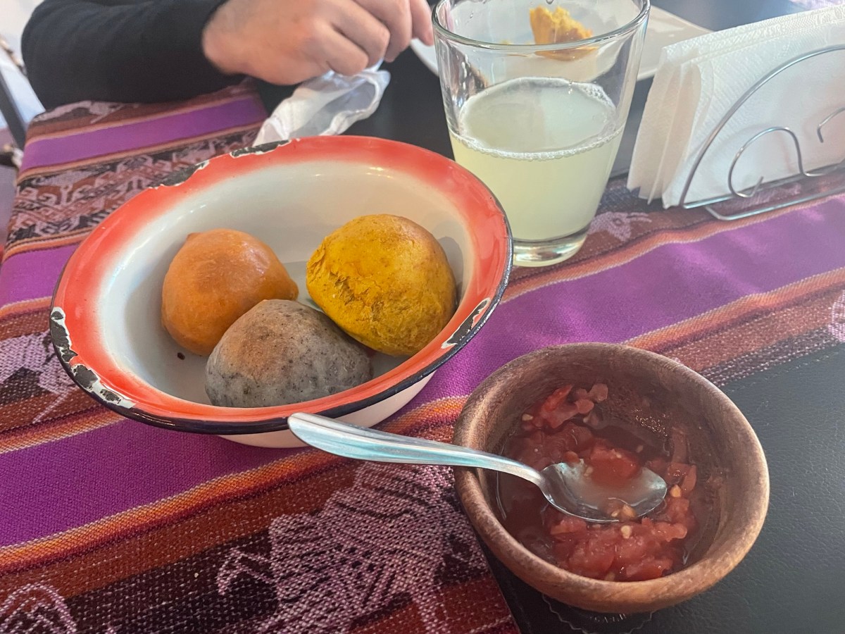 In secondo luogo, vale la pena parlare di alcuni piatti del Nord che conservano la tradizione precolombiana, condivisa con altri Paesi andini: i tamales e le humitas. Entrambe sono preparazioni avvolte in foglie di mais e lessate direttamente nel loro involucro. I tamales prevedono carne e altri ingredienti, mentre le humitas sono vegetariane e includono formaggio (almeno questa era la differenza tra quelle che abbiamo assaggiato noi). Naturalmente, per mangiarli bisogna aprirli: la foglia di mais serve solo da involucro. La base di mais (lì lo chiamano choclo), presente anche nel ripieno, conferisce un sapore delicato tendente al dolce, in contrasto con gli altri ingredienti.