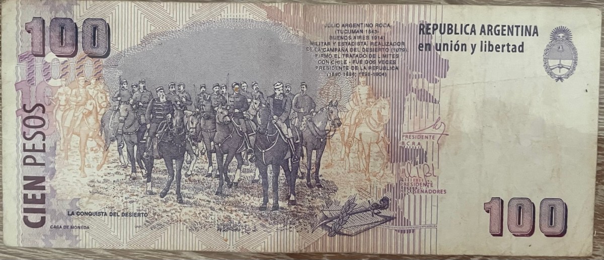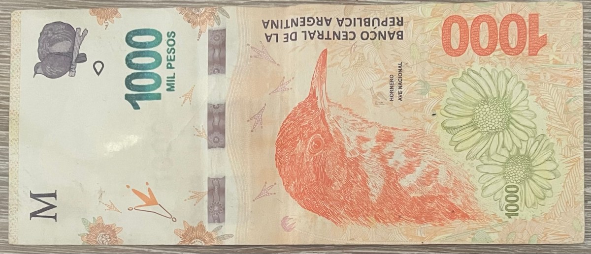 Los billetes de peso que aparecen aquí (dado el valor de la moneda, no existe dinero de metal) no pretenden ser una lista exhaustiva, sino ejemplos de los que más han circulado por nuestras manos. Como he dicho antes, me parecen preciosos. En términos generales, los de más valor plasman la imagen de algún héroe patrio, mientras que los menos valiosos contienen la imagen de animales nacionales de los que los argentinos se sienten muy orgullosos.: El yaguareté, la ballena y el hornero.
